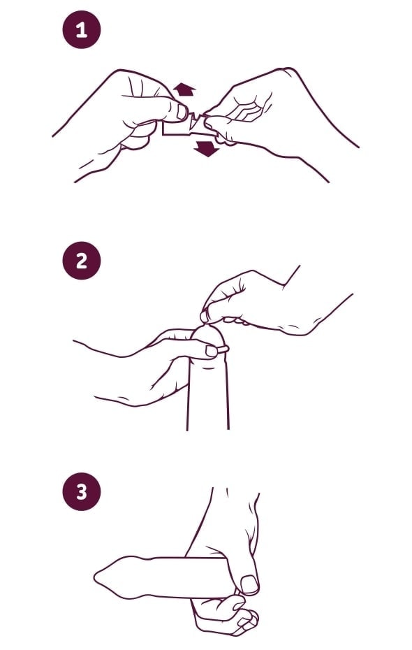 - Handle the condom carefully. Open the package as shown in the drawing. Avoid sharp objects such as sharp nails, jewelry etc. when handling and opening. First roll up the condom a bit so that it is clearly visible in which direction it should be rolled on.