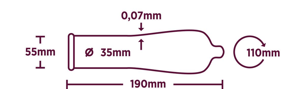 NB! The width is not the same as the diameter. The width measurement applies when the condom is flat.