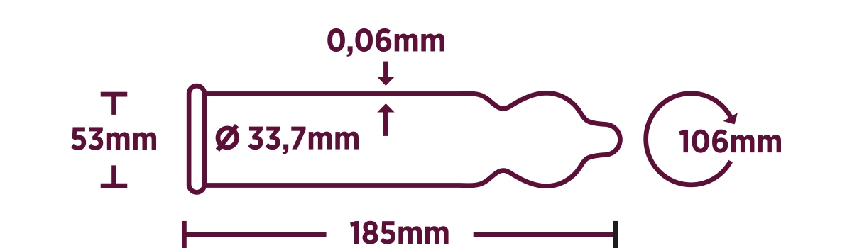 NB! The width is not the same as the diameter. The width measurement applies when the condom is flat. In addition to these measurements, we also indicate how thin the condom is.