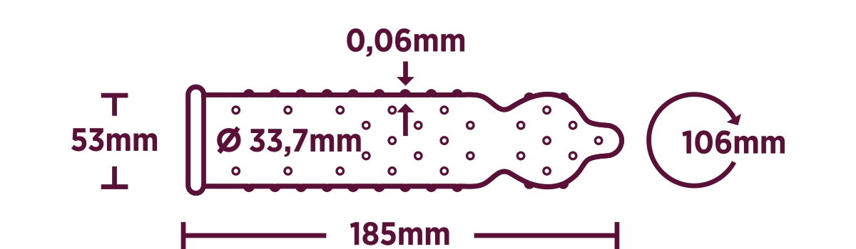 We describe the dimensions of our condoms by specifying length, circumference, width and diameter.