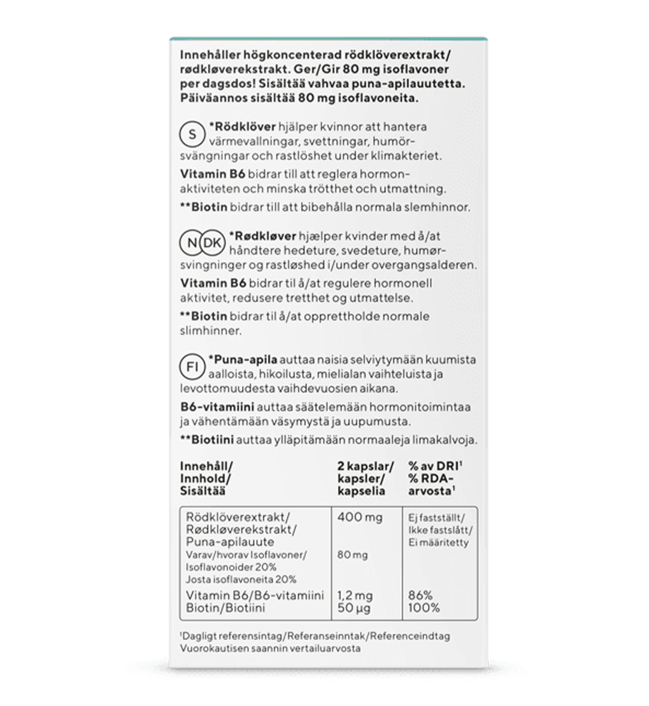 Contents 2 capsules % of RDI1 Red clover extract 400 mg ** –of which Isoflavones (20%) 80 mg ** Vitamin B6 1,2 mg 86% Biotin 50 µg 100% 1Reference daily intake