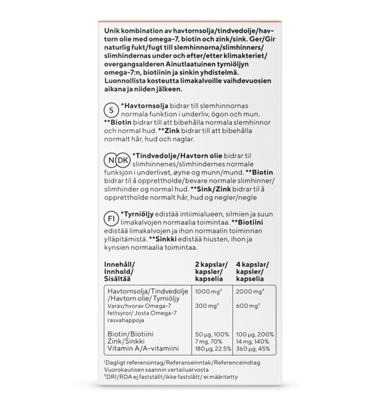 Content 2 capsules % of RDI1 4 capsules % of RDI1 Sea buckthorn oil 1000 mg ** 2000 mg ** of which standardized Omega-7 fatty acids 300 mg ** 600 mg ** Biotin 50 µg 100% 100 µg 200% Zinc 7 mg 70% 14 mg 140% Vitamin A 180 µg 22,5% 360 µg 45% 1Reference daily intake