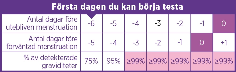 You can use the RFSU Pregnancy Test Early as early as 6 days before your missed period, which is 5 days before your period is expected. ‘Missed period’ refers to the day after your expected period. In lab tests, 75% of pregnancy results were detected 5 days before your expected period, 95% were detected 4 days before and >99% were detected from 3 days before your expected period. If you test before your expected period, you should use morning urine. If you get a weak positive result or are unsure of the result, test again with morning urine 2 days later.