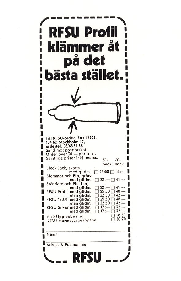 Restrictions on condom sales were not removed until 1970. By then, RFSU had already started its Blommor och Bin store chain, and launched the Profil condom, which was already considered a classic, and jokingly dubbed “the Volvo of condoms”. RFSU also ran campaigns on billboards all over Stockholm, which were shocking to some at the time.