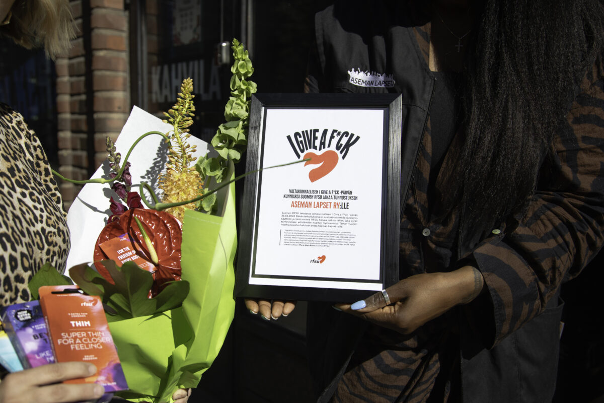 I Give a F*ck -päivänä annettava tunnustus Aseman Lapset ry:lle sisältää RFSU:n resursseja käytettäväksi seksuaalikasvatustyöhön ja RFSU:n tuotteita.