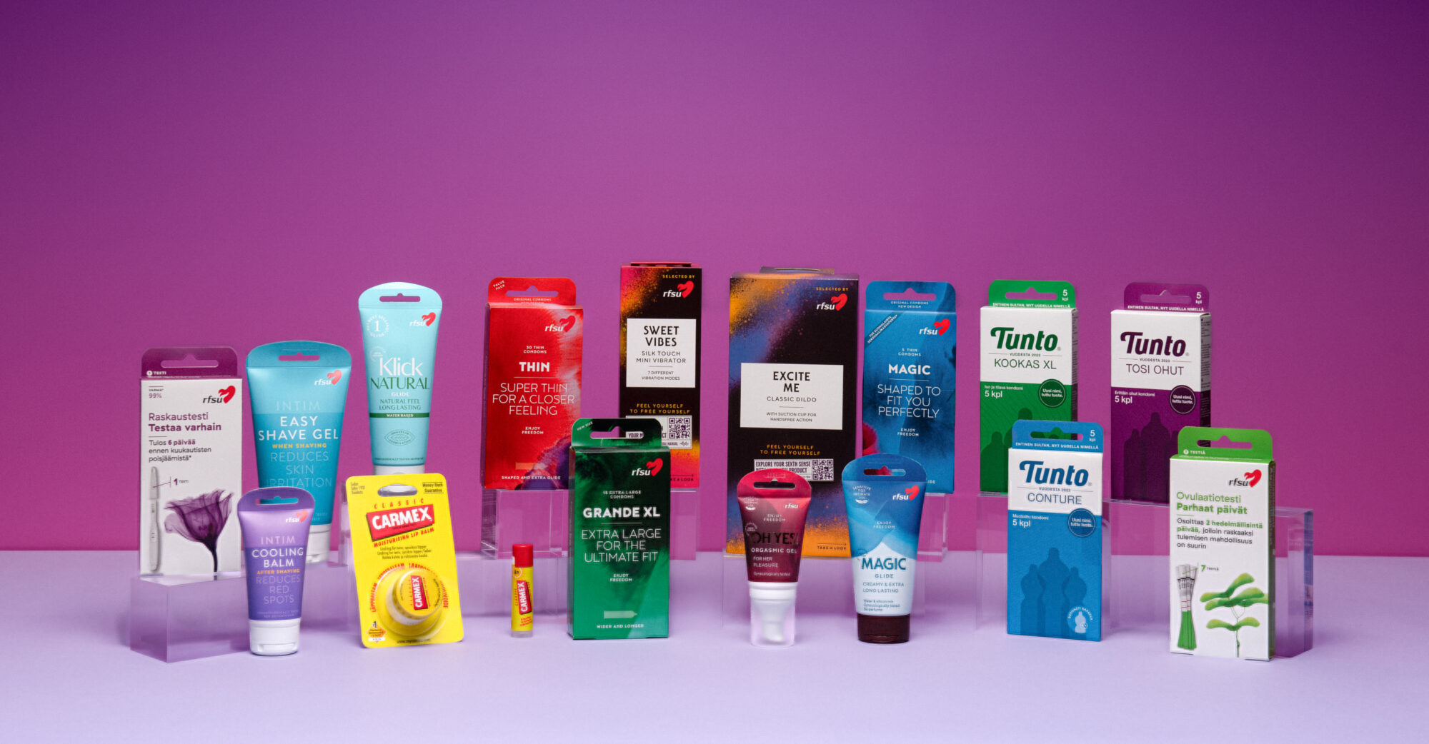 - Tuotevalikoimaamme kuuluu kondomit, raskaus- ja ovulaatiotestit, liukuvoiteet, huulirasvat, seksivälineet ja intiimihygienia- sekä menopaussituotteet.