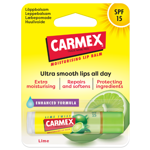 Carmex Lime Stick on ultrakosteuttava huulirasvapuikko, joka palauttaa jopa kuivimpien huulien kosteuden ja saa ne tuntumaan terveiltä ja pehmeiltä. Hauska limen aromi on eksoottinen tuulahdus tropiikista. SPF15-suojakerroin suojaa huuliasi samalla kun tuotteen sisältämä kaakaovoi rauhoittaa ja pehmentää huulten ihon.