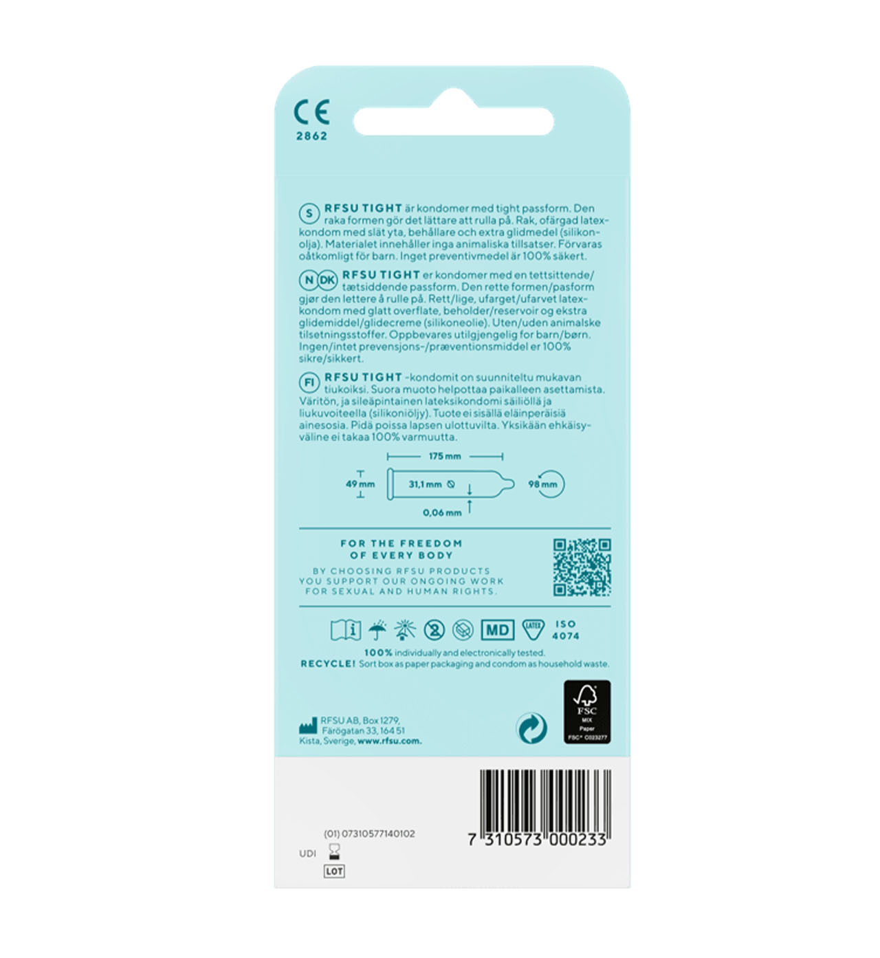 RFSU AB:llä on oma akkreditoitu laboratorio ja se on sertifioitu Intertek Medical Notified Body -laitoksen kautta (CE-numero 2862) ja laadunvarmistettu seuraavien standardien mukaisesti;