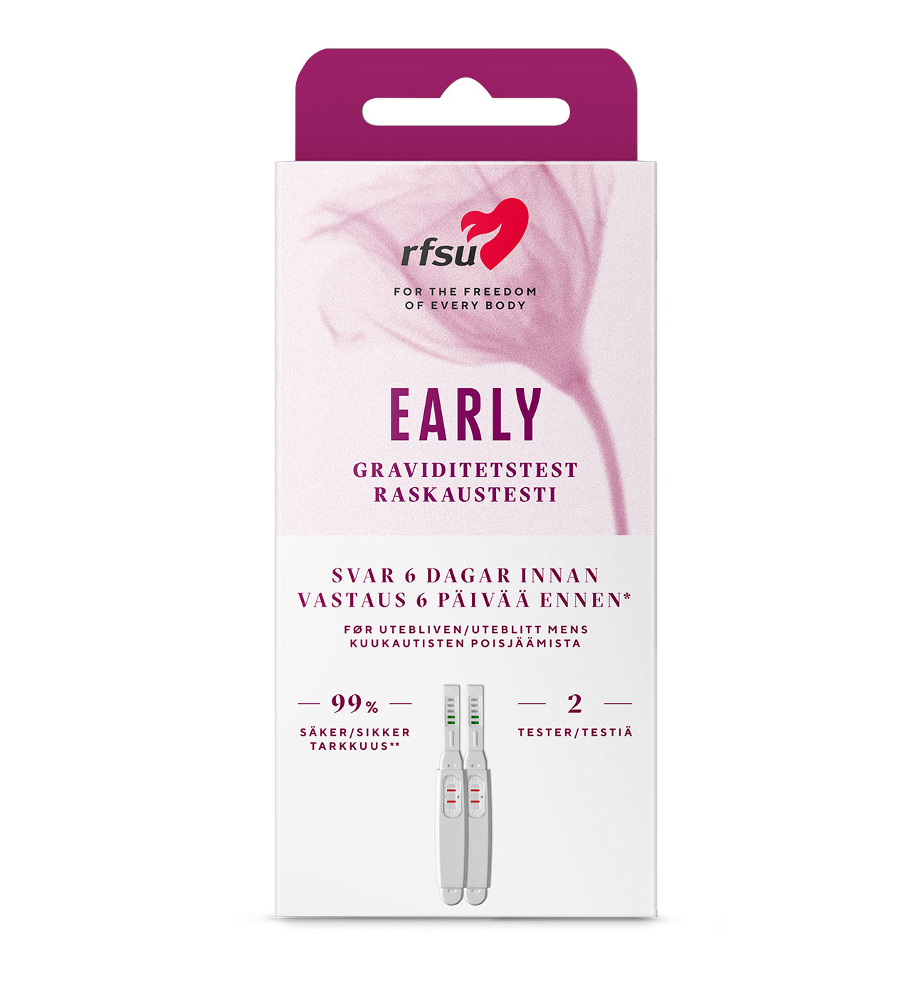 RFSU Early Raskaustestillä voit nopeasti ja helposti selvittää, oletko raskaana mahdollisimman varhaisessa vaiheessa. Se on RFSU:n herkin raskaustesti, ja sen voi tehdä jo 6 päivää ennen kuin kuukautiset ovat myöhässä*. Testin herkkyys on 10 mlU/ml hCG-hormonia virtsassa. Helppo käyttää, virtsaa suoraan testiin. Nopea vastaus 1–5 minuutissa. Näyttää selkeän tuloksen yhdellä tai kahdella viivalla. Jos testi näyttää heikon positiivisen tuloksen, on suositeltavaa tehdä testi uudelleen 2 päivää myöhemmin. Testi on yli 99 % luotettava kuukautisten odotetusta alkamispäivästä lähtien. Voit tehdä testin milloin tahansa päivällä, mutta turvallisinta on mitata aamun ensimmäisestä virtsasta, jolloin hCG-pitoisuus on korkeimmillaan.