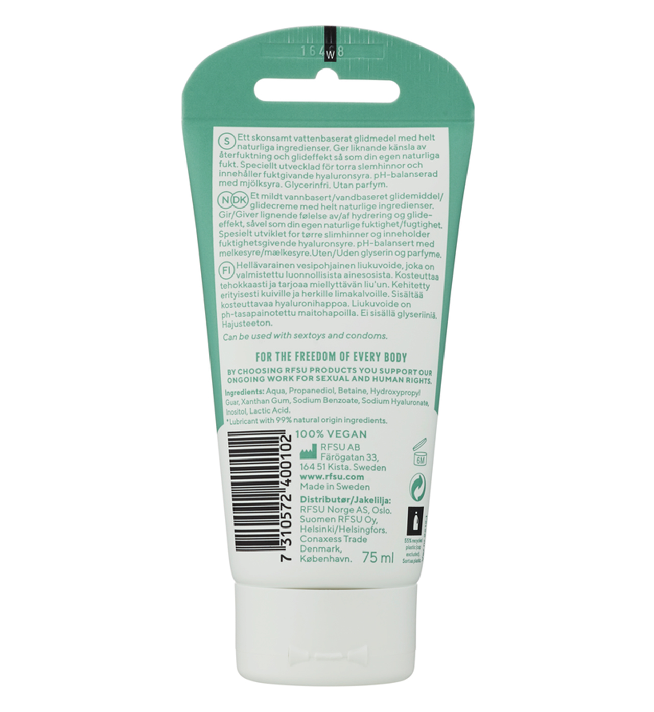 Jos sinusta tuntuu, että halua riittää, mutta kosteus puuttuu, liukuvoide voi auttaa. RFSU Natural Moist Glide on vesipohjainen liukuvoide, joka tarjoaa samanlaisen tuntuman kuin luonnollinen kosteutesi ja juuri sopivasti liukuvuutta. Se sisältää kosteuttavaa hyaluronihappoa ja 99 % luonnollisia ainesosia. Natural Moist Glide on hajusteeton ja pH-tasapainotettu maitohapolla.