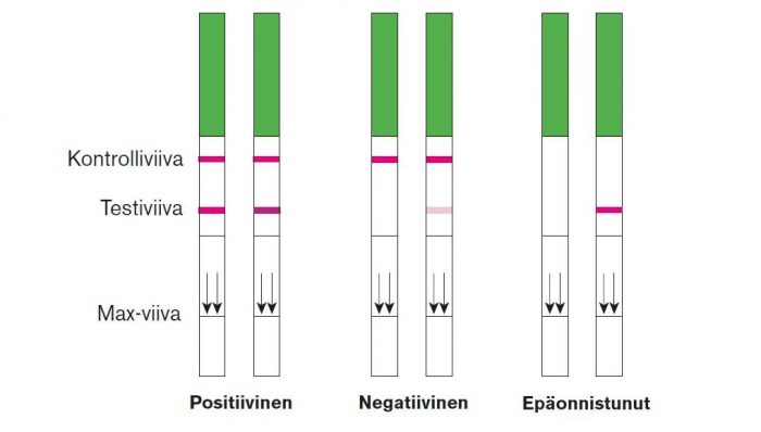 Mikäli tikussa näkyy kaksi värillistä viivaa, ja testiviiva on yhtä vahva tai