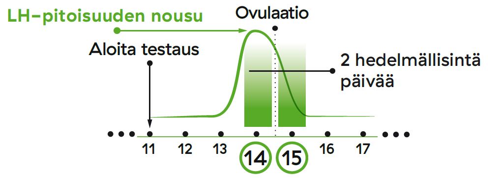 Normaalisti luteinisoivan hormonin (LH) taso nousee dramaattisesti ennen munasolun irtoamista, joka tapahtuu noin puolivälissä jokaista kuukautiskiertoa. Muutama tunti tai jopa vuorokausi tämän piikin jälkeen munasolu irtoaa munasarjoista, jota kutsutaan ovulaatioksi. LH-hormonin tason ollessa huipussaan olet hedelmällisimmilläsi seuraavien kahden päivän ajan. Jos olet yhdynnässä seuraavien 48 tunnin sisällä, mahdollisuutesi tulla raskaaksi paranevat. Koska miehen siittiösolut saattavat selviytyä useita päiviä, voit tulla raskaaksi myös, jos olet yhdynnässä ennen kuin LH-arvosi ovat kohonneet.- Testin herkkyys on 25mlU ovulaatiohormoni LH:sta