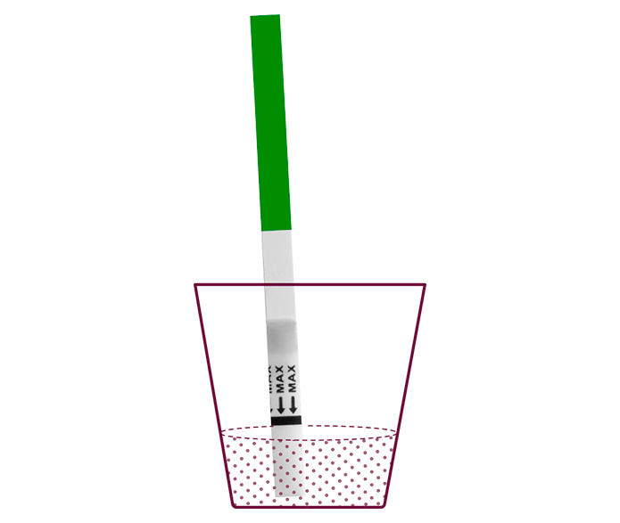 Upota näytteenottopää virtsaan siten, että nuolet osoittavat alaspäin. Älä upota tikkua max-viivaa syvemmälle. Nosta tikku pois 15 sekunnin kuluttua ja laita se tasaiselle, puhtaalle ja kuivalle alustalle.