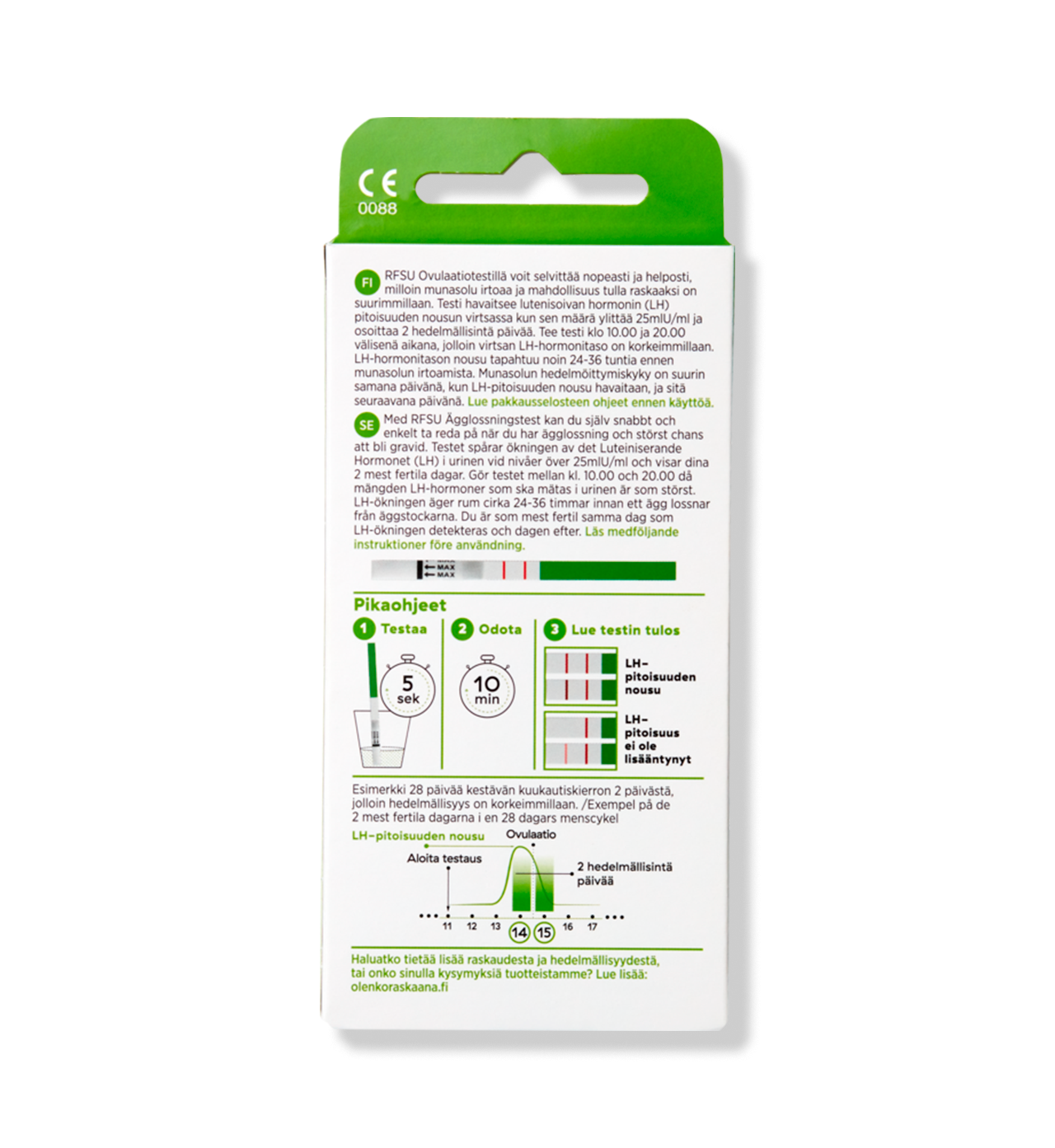 RFSU Ovulaatiotesti on 96 % luotettava LH-pitoisuuden nousun mittaamiseen, joka tapahtuu munasolun irrotessa. Testi on samantyyppinen testi, jota kätilöt ja gynekologit käyttävät.