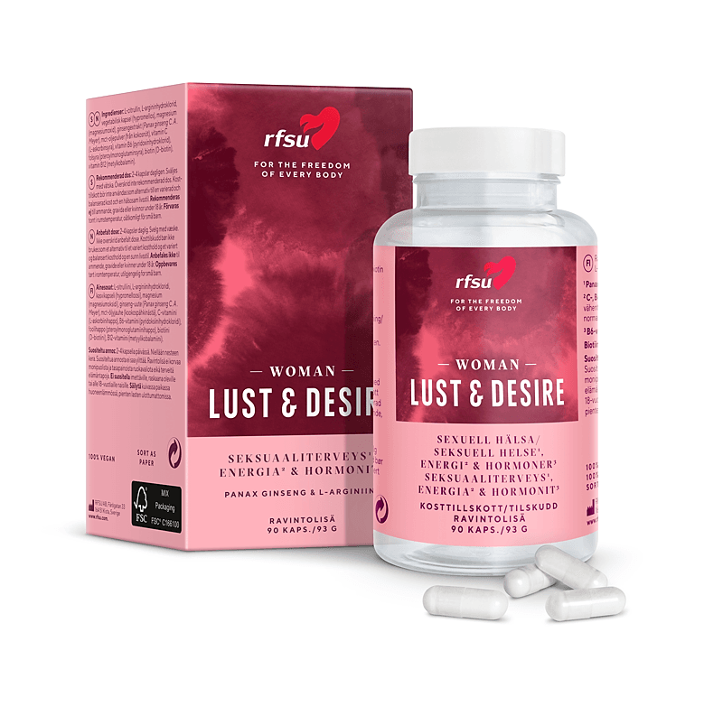 Vähentynyt seksuaalinen halu liittyy usein energian puutteeseen, stressiin ja hormonaaliseen epätasapainoon. Kun keho on epätasapainossa, myös mielihyväkeskus kärsii, jolloin nautinnon ja kiihottumisen kokeminen vaikeutuu. RFSU Lust & Desire Woman on ravintolisä, joka on suunniteltu tukemaan naisten seksuaaliterveyttä, energiatasojaa ja hormonitasapainoa. Se sisältää yhdistelmän aminohappoja, vitamiineja, kivennäisaineita ja kasviuutteita, jotka on valittu huolellisesti tukemaan elimistöä monella tasolla: