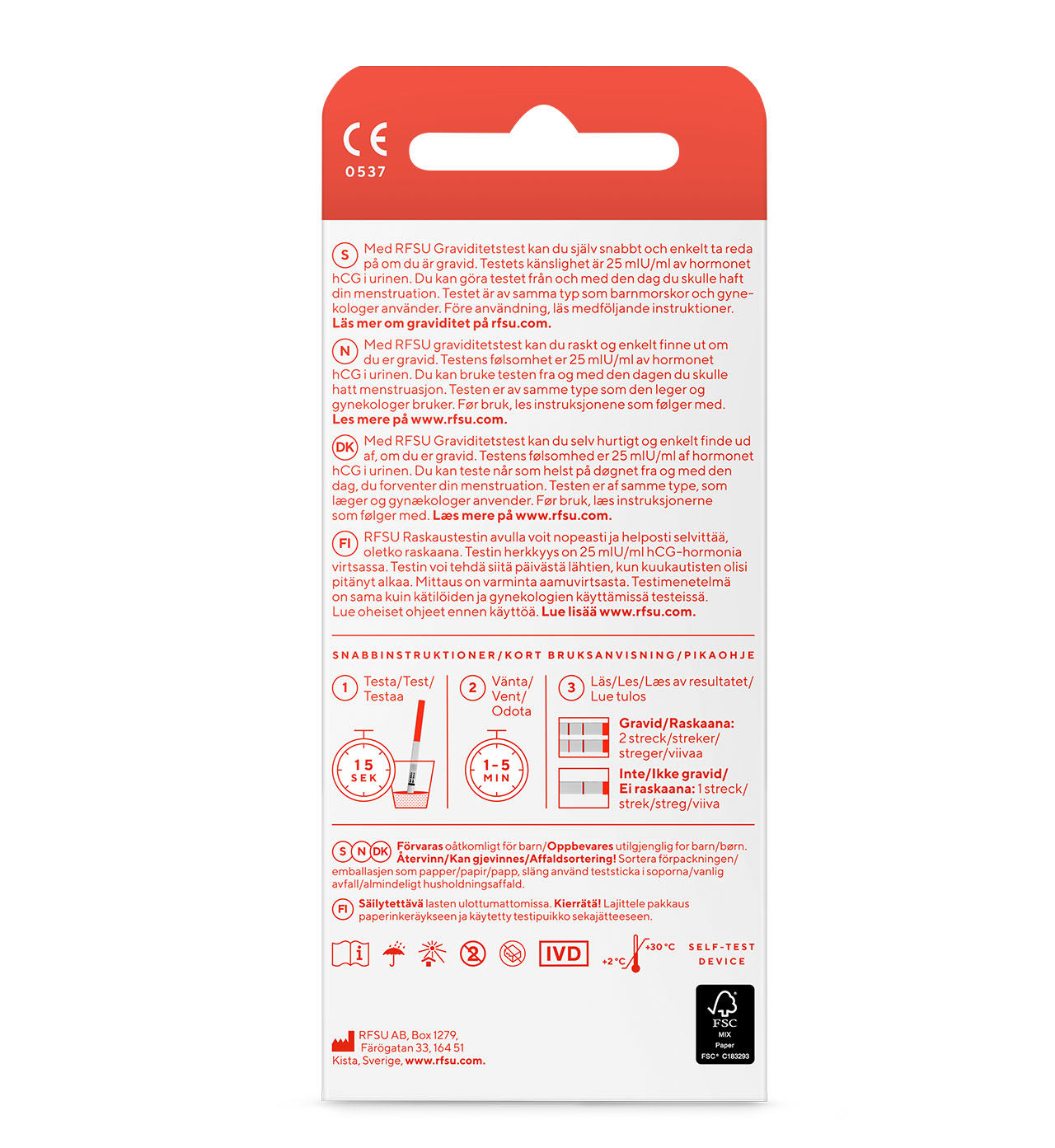 Med RFSU Graviditetstests testpinner kan du raskt og enkelt finne ut om du er gravid. Gir svar innen 1 minutt ved test samme dag som du forventer mensen. Testens følsomhet er 25 mlU/ml av hormonet hCG i urin. Brukervennlige teststrimler som dyppes i beholdere med urin. Viser tydelige resultat med en eller to streker. Testen er over 99 % pålitelig fra den dagen du forventer mensen. Du kan teste når som helst på dagen, men det er tryggest å måle morgenurinen da hCG-konsentrasjonen er høyest. RFSU Graviditetstest Strips er samme type som jordmødre og gynekologer bruker.