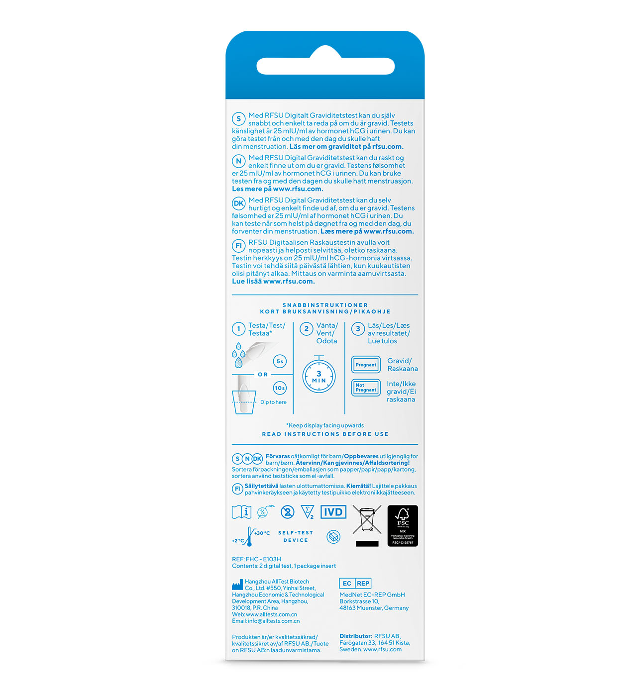Vår digitale graviditetstest gir mer enn 99 % nøyaktige resultater fra den dagen du forventer mensen. Vi anbefaler ikke at du utfører testen før forventet menstruasjon. Bruk i stedet RFSU Early Graviditetstest eller RFSU Weeks Graviditetstest, som kan brukes til å oppdage graviditet på et tidlig stadium.