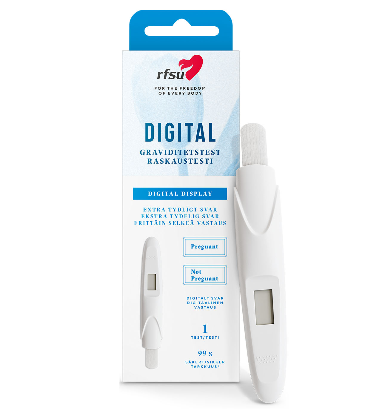 Med RFSU Graviditetstest Digital kan du raskt og enkelt finne ut om du er gravid. Den digitale testen gir et tydelig testresultat med teksten «Pregnant» = Gravid eller «Not Pregnant» = Ikke gravid. Superenkel å bruke, takket være en ekstra bred spiss som gjør det lettere å tisse direkte på testen. Digital skjerm som viser resultatet innen 3 minutter. Du kan ta testen fra samme dag som du forventer mensen.