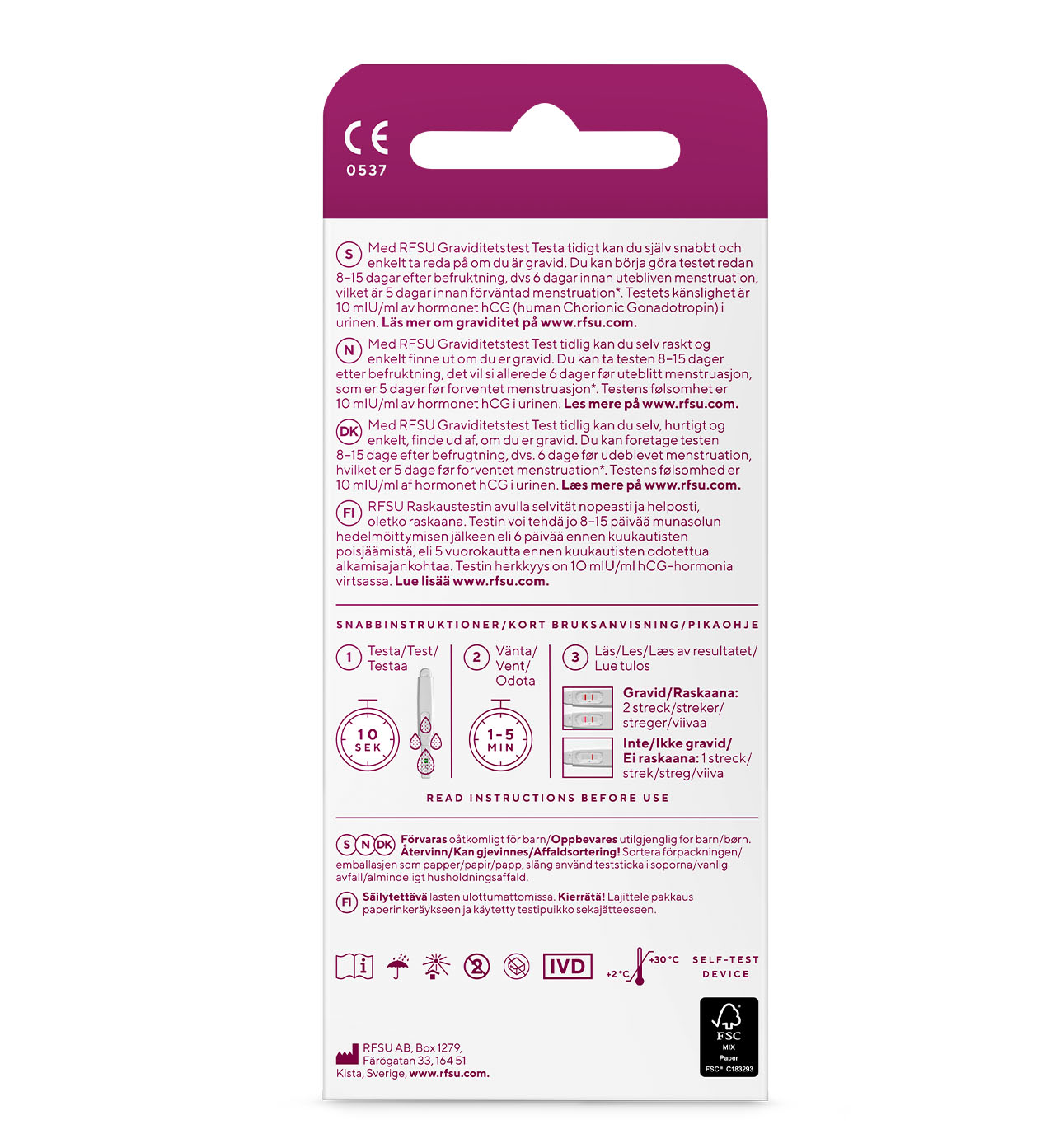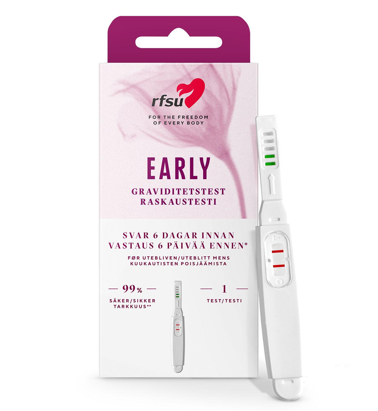 Med RFSU Graviditetstest Early kan du raskt og enkelt finne ut om du er gravid så tidlig som mulig. Det er RFSUs mest følsomme graviditetstest og du kan ta testen allerede 6 dager før uteblitt menstruasjon*. Testens følsomhet er 10 mlU/ml av hormonet hCG i urin. Enkel å bruke, tiss direkte på testen. Rask respons innen 1-5 minutter. Viser tydelig resultat med en eller to linjer. Hvis testen viser et svakt positivt resultat, anbefales det å teste på nytt 2 dager senere. Testen er over 99 % pålitelig fra den dagen du forventer mensen. Du kan teste når som helst på døgnet, men det er tryggest å måle morgenurinen da hCG-konsentrasjonen er høyest.