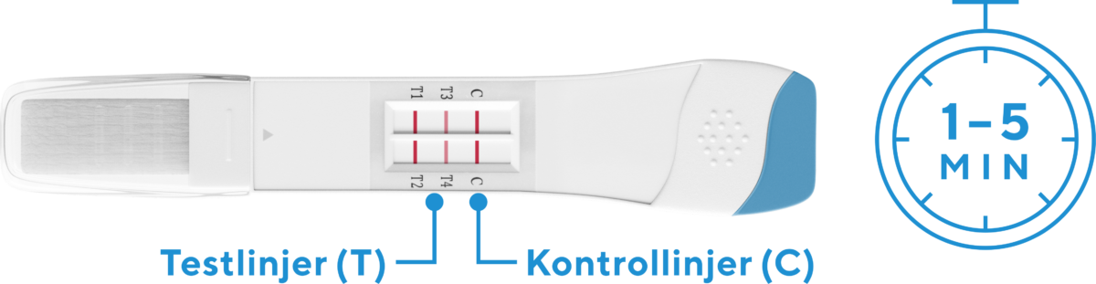 Testpinnen har 2 kontrollstreker (C) og 4 ulike teststreker (T1-T4) for å vise antall graviditetsuker.