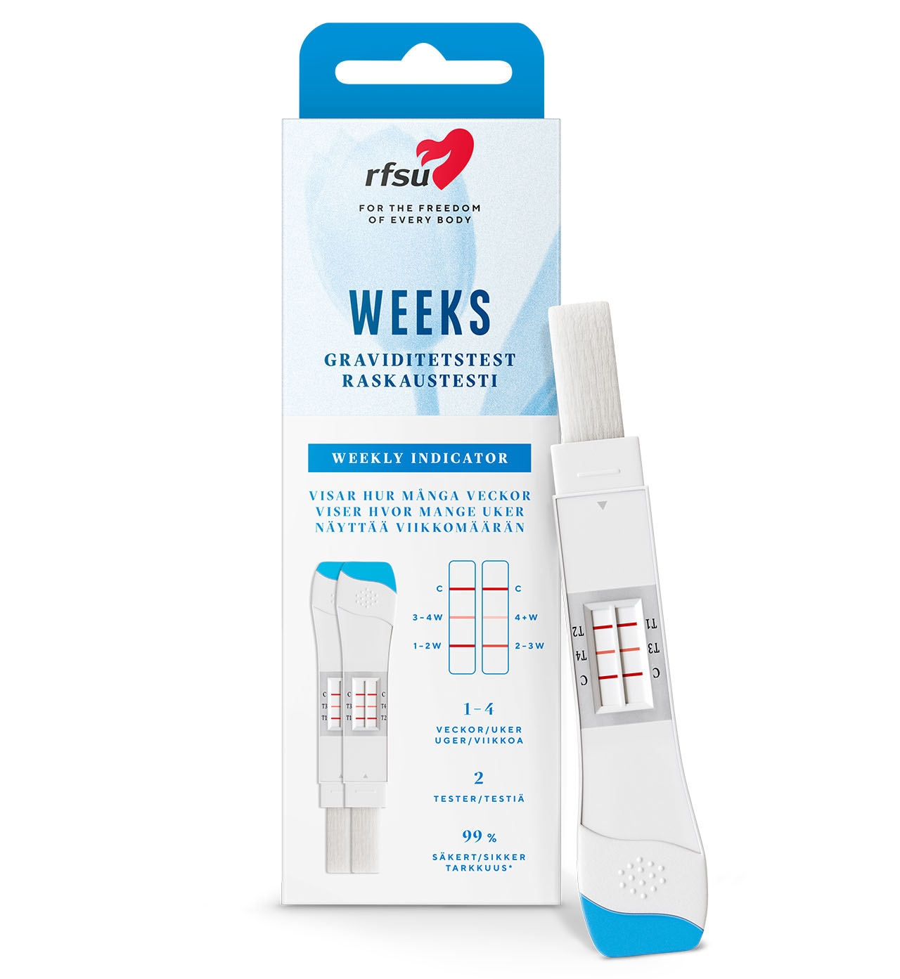 Med RFSU Weeks Graviditetstest kan du raskt og enkelt finne ut om du er gravid. Med Weeks får du to tester i én, ettersom den viser om du er gravid eller ikke, men også hvor langt du er kommet i svangerskapet. Testen har en smart ukeindikatorfunksjon som indikerer hvor mange uker det er siden befruktning. Viser tydelig resultat med streker som er enkle å lese. Testen har 4 forskjellige teststreker for å vise antall uker gravid (1-2 uker, 2-3 uker, 3-4 uker, 4+ uker).