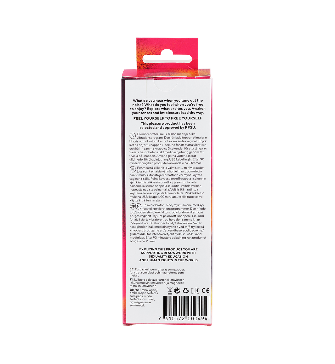Sweet Vibes fra RFSU er en liten og smidig minivibrator med en riflet tupp som stimulerer klitoris og som kan gi deg deilige orgasmer. Vibratoren kan også brukes vaginalt for deg som ønsker å variere opplevelsene. Du kan velge mellom syv unike vibrasjonsprogrammer gjennom ett enkelt knappetrykk. Sweet Vibes er laget av mykt silikon som kjennes deilig mot huden, og som dessuten er helt vanntett, slik at du skal kunne ta med nytelsen til dusjen og badet. For ekstra nytelse kan du bruke din minivibrator med litt vannbasert glidemiddel.