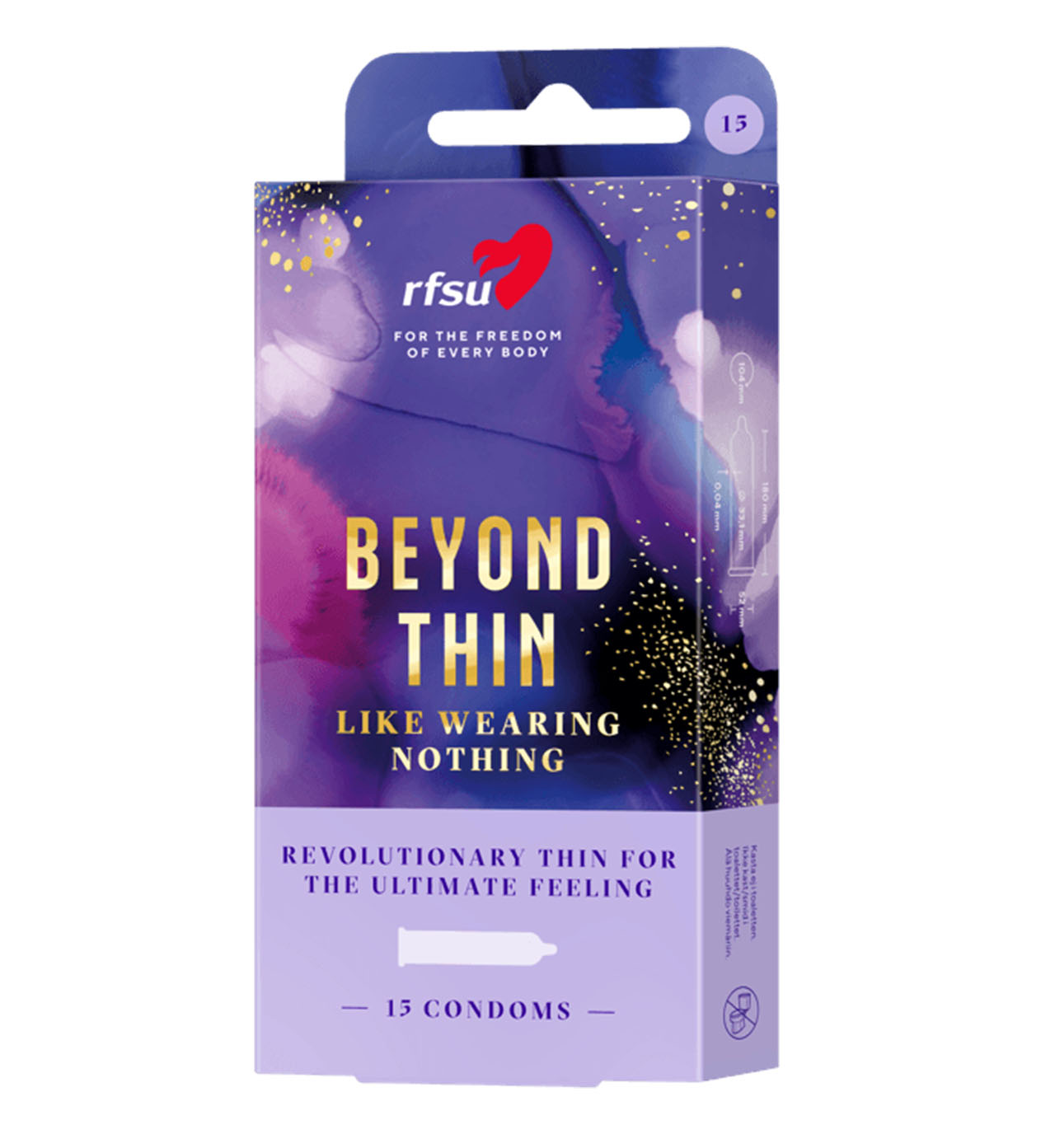 Här ovanför är en visualisering av storleken på kondomen RFSU Beyond Thin. Här nedanför är måtten i skrift.