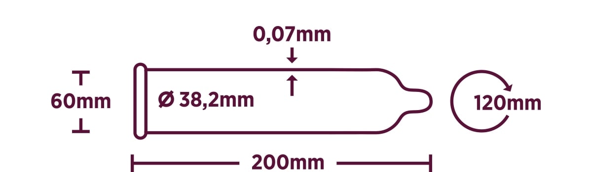 För att kunna veta vilken kondom som passar dig behöver du kunna tolka vår visualisering korrekt. Nedan förklarar vi den översta illustrationen till höger: