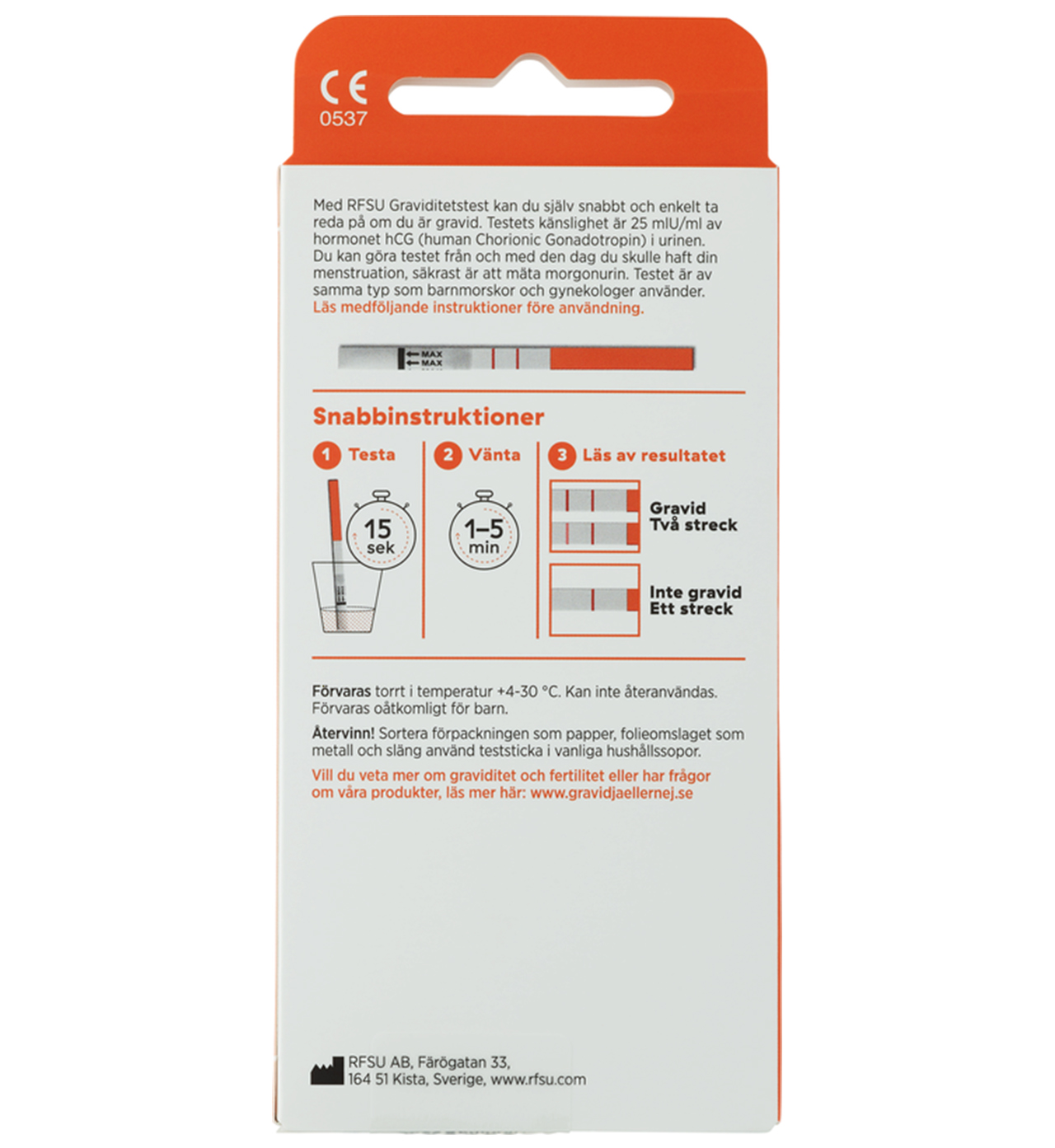 Om endast ett rosa kontrollstreck visas i resultatområdet är du inte gravid. Om du ändå inte får din menstruation, gör ett nytt test efter 2 dagar, helst med den första morgonurinen.