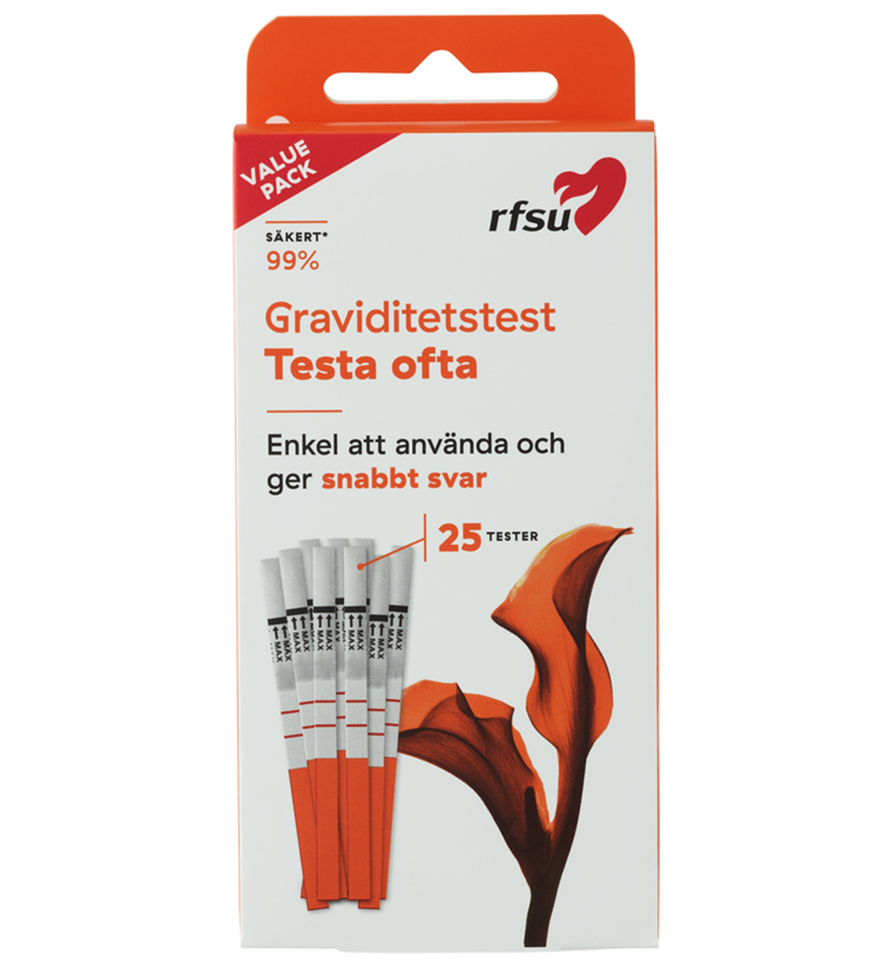 - Testets känslighet är 25 mlU/ml av hormonet hCG (human Chorionic Gonadotropin) i urinen.