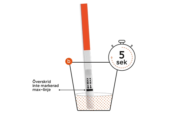 - Rekommenderas att testas med morgonurin för säkrast resultat. Samla urin i en behållare och doppa testet i urin.
