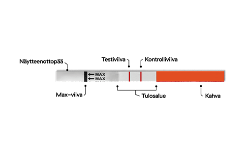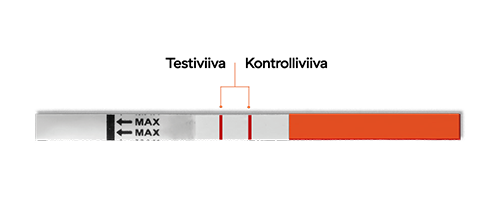 Tulosalueen vaalealle taustalle ilmaantuu joko yksi tai kaksi punaista/vaaleanpunaista viivaa. Toinen on kontrolliviiva ja toinen testitulos. Lue tulos mahdollisimman pian 1-5 minuutin sisällä. Älä lue testitulosta enää 5 minuutin jälkeen, sillä se saattaa antaa harhaanjohtavan tuloksen.