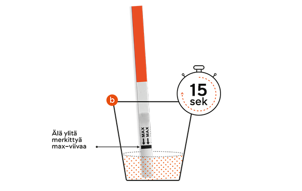 Upota näytteenottopää virtsaan siten, että nuolet osoittavat alaspäin. Älä upota tikkua max-viivaa syvemmälle. Nosta tikku pois 15 sekunnin kuluttua, ja laita se tasaiselle, puhtaalle ja kuivalle alustalle.